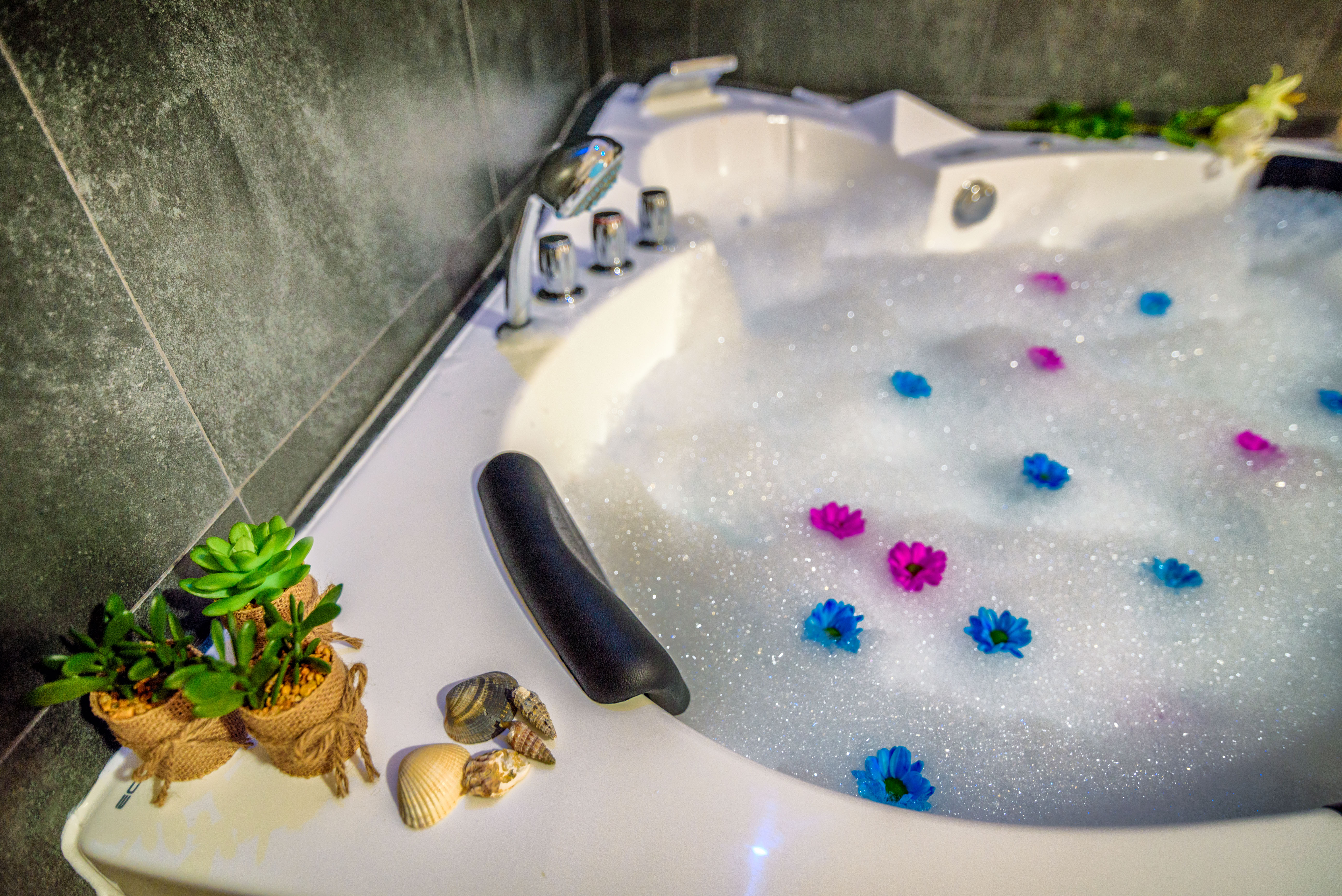 Jacuzzi privado a los pies de la cama de matrimonio.