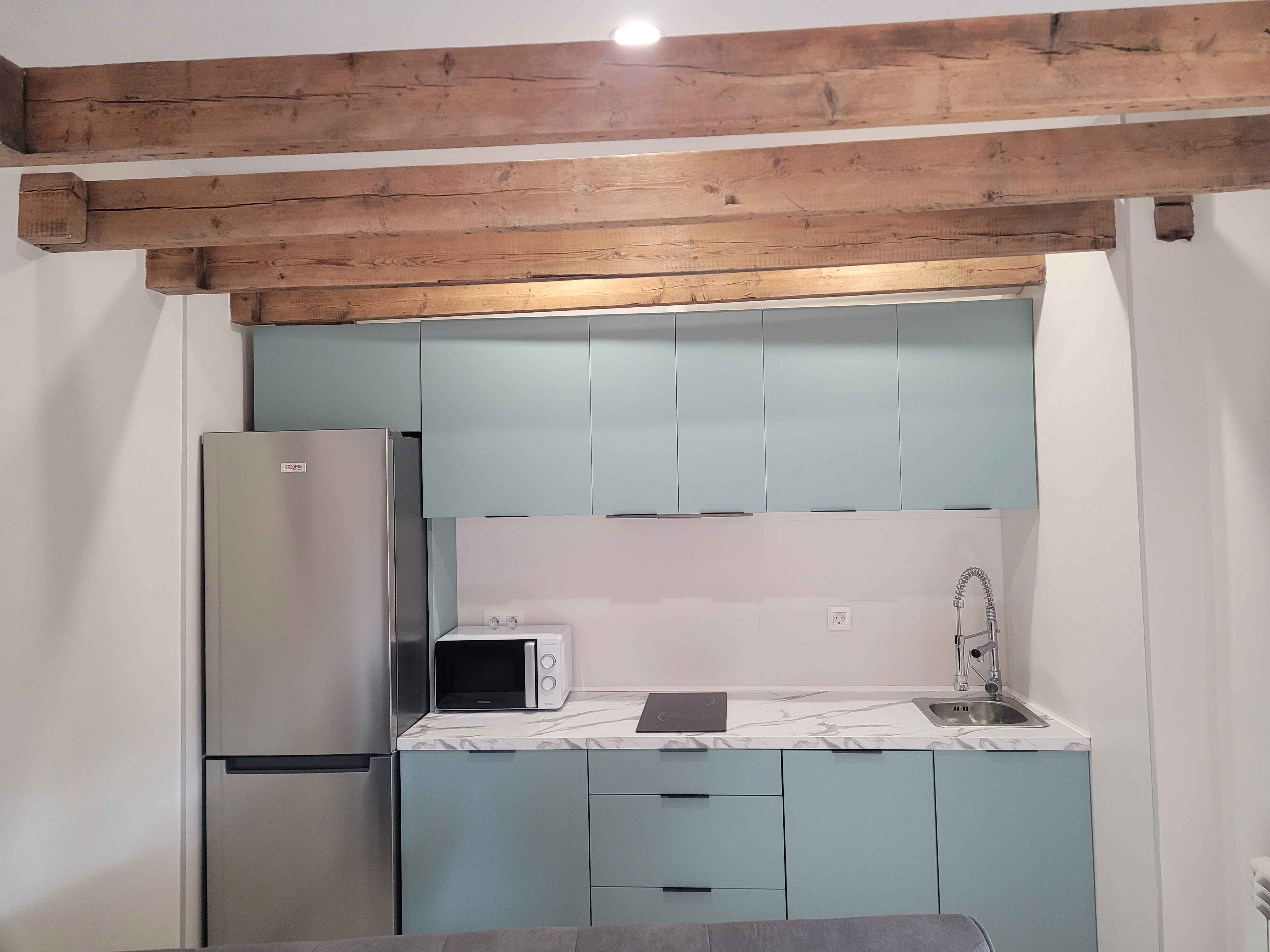La cocina está equipada con vitroceramica, lavadora-secadora, lavavajillas, frigorífico con congelador, microondas y pequeños electrodomésticos como cafetera, batidora, tostadora, hervidor de agua, etc.
