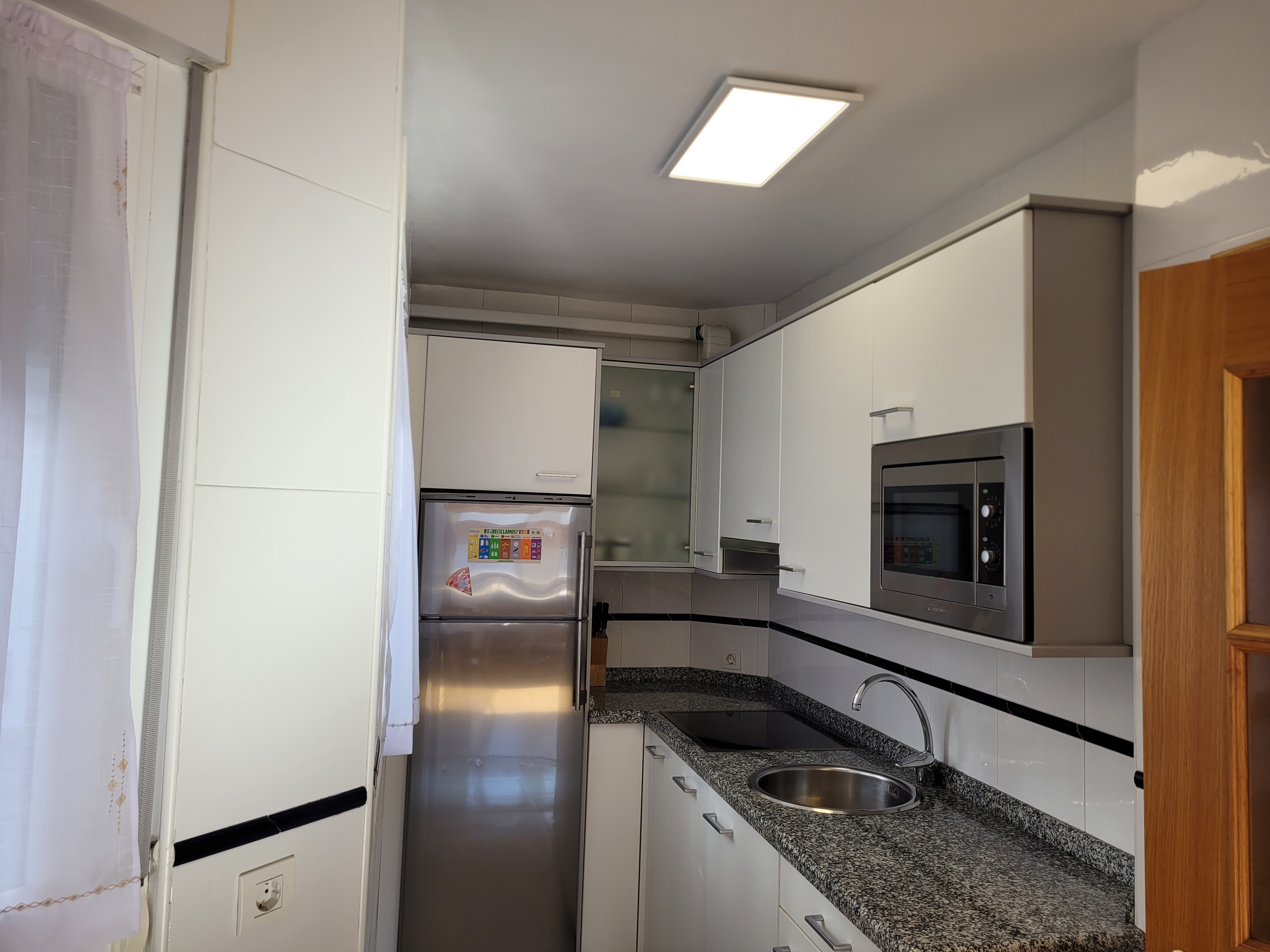 La cocina está totalmente equipada con los principales electrodomésticos tales como frigorífico tipo combi, vitrocerámica, lavavajillas, lavadora, microondas, campana extractora… y además dispone de pequeño electrodoméstico como cafetera, batidora, tostadora y exprimidor. El apartamento está equipado de vajilla, cristalería y cubertería, así como todo el menaje necesario para cocinar.