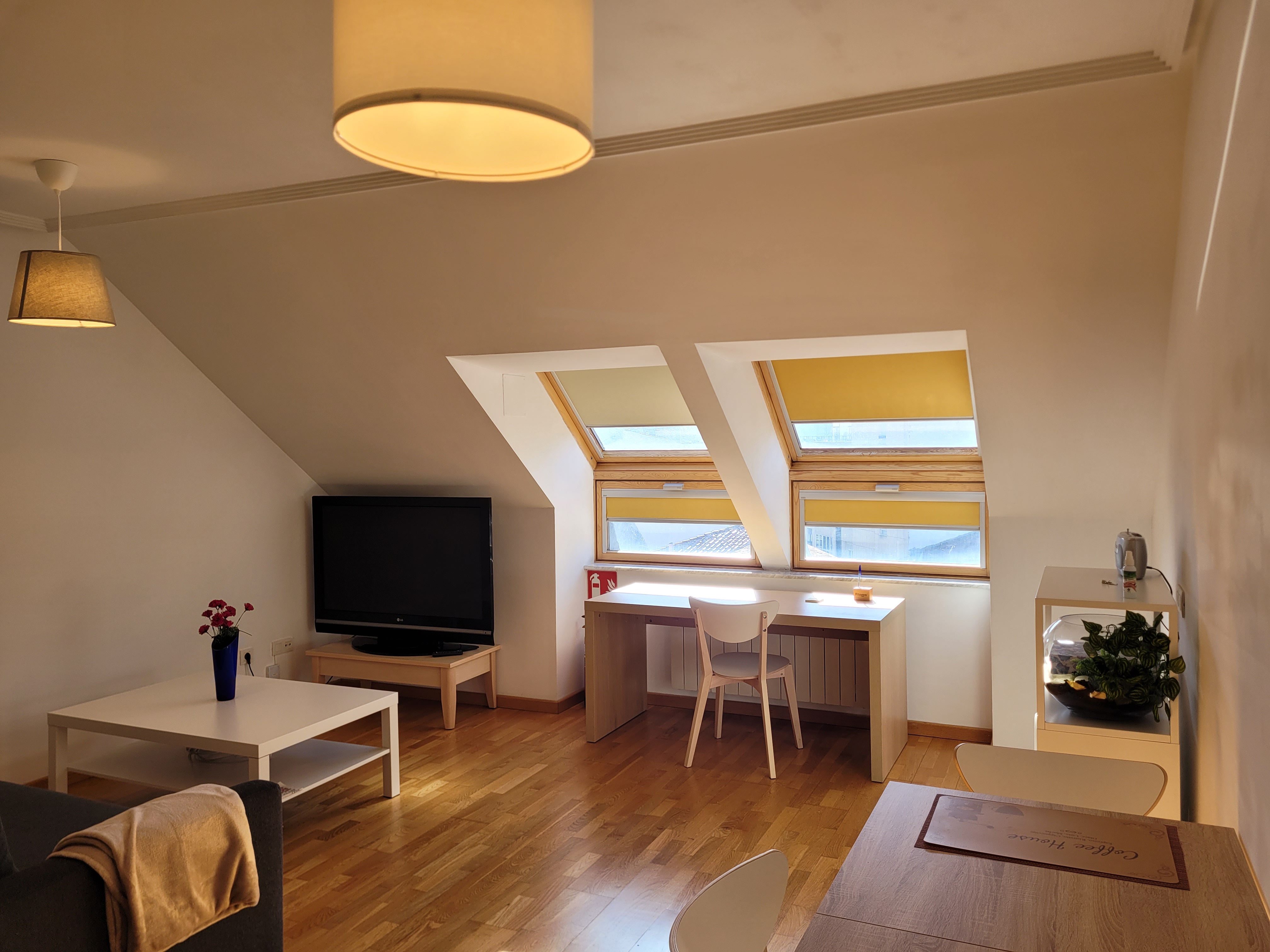 El salón abuhardillado tiene un confortable sofá, que en caso de necesidad se convierte en una cama doble. La televisión es de pantalla plana de 50”.